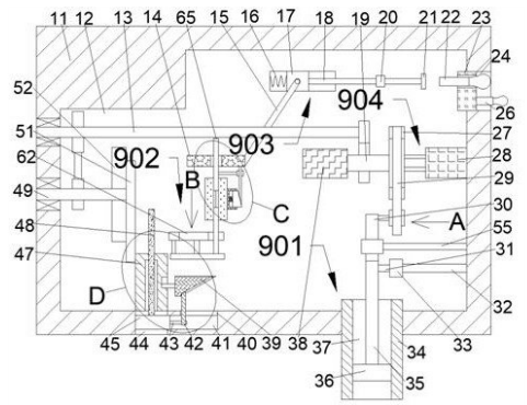 所述測電滑槽前后側(cè)以及左側(cè)內(nèi)壁滑動連接有延伸至所述開關(guān)塊槽內(nèi)與所述開關(guān)塊槽滑動連接的開關(guān)塊,所述開關(guān)塊右端面固定連接有與所述斜面滑桿固定連接的連桿,根據(jù)所述圓盤軸的轉(zhuǎn)動使得所述測電塊上下往復(fù)移動,從而使得所述測電滑槽開啟使得所述測電導(dǎo)線下移至所述工作腔外側(cè)檢查燈箱是否漏電導(dǎo)致水中帶電,
